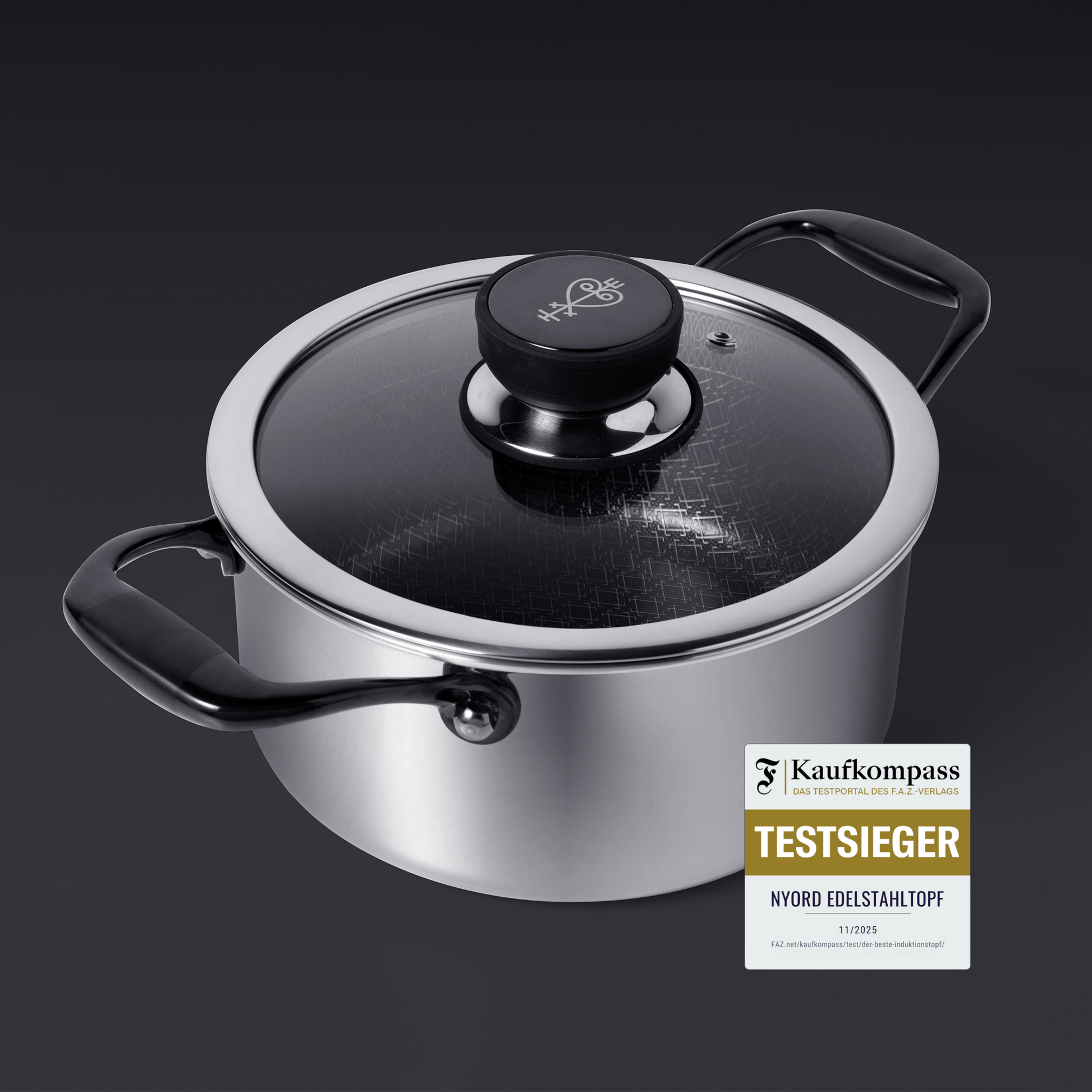 Unser Kochtopf wurde im großen Vergleichstest des FAZ Kaufkompass als Testsieger ausgezeichnet. Besonders hervorgehoben wurden die hervorragende Wärmeverteilung, die hochwertige Verarbeitung und der starke Antihaft-Effekt der Hybrid Protection Keramikbeschichtung. Damit gehört der Kochtopf offiziell zu den besten Induktionstöpfen auf dem deutschen Markt.
